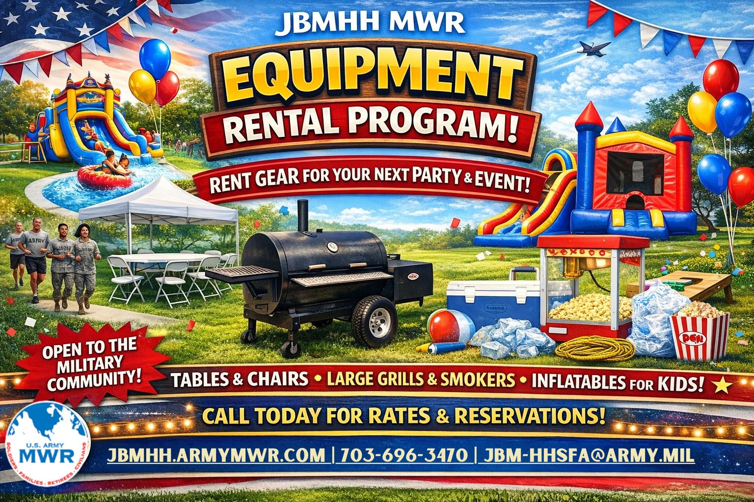 JBMHH MWR's Equipment Rental Program provides the military community with an easy, affordable way to elevate any gathering - from backyard celebrations to unit functions and large-scale events. With a wide selection of high-quality gear, families and units can create memorable experiences without the hassle of purchasing or storing equipment.