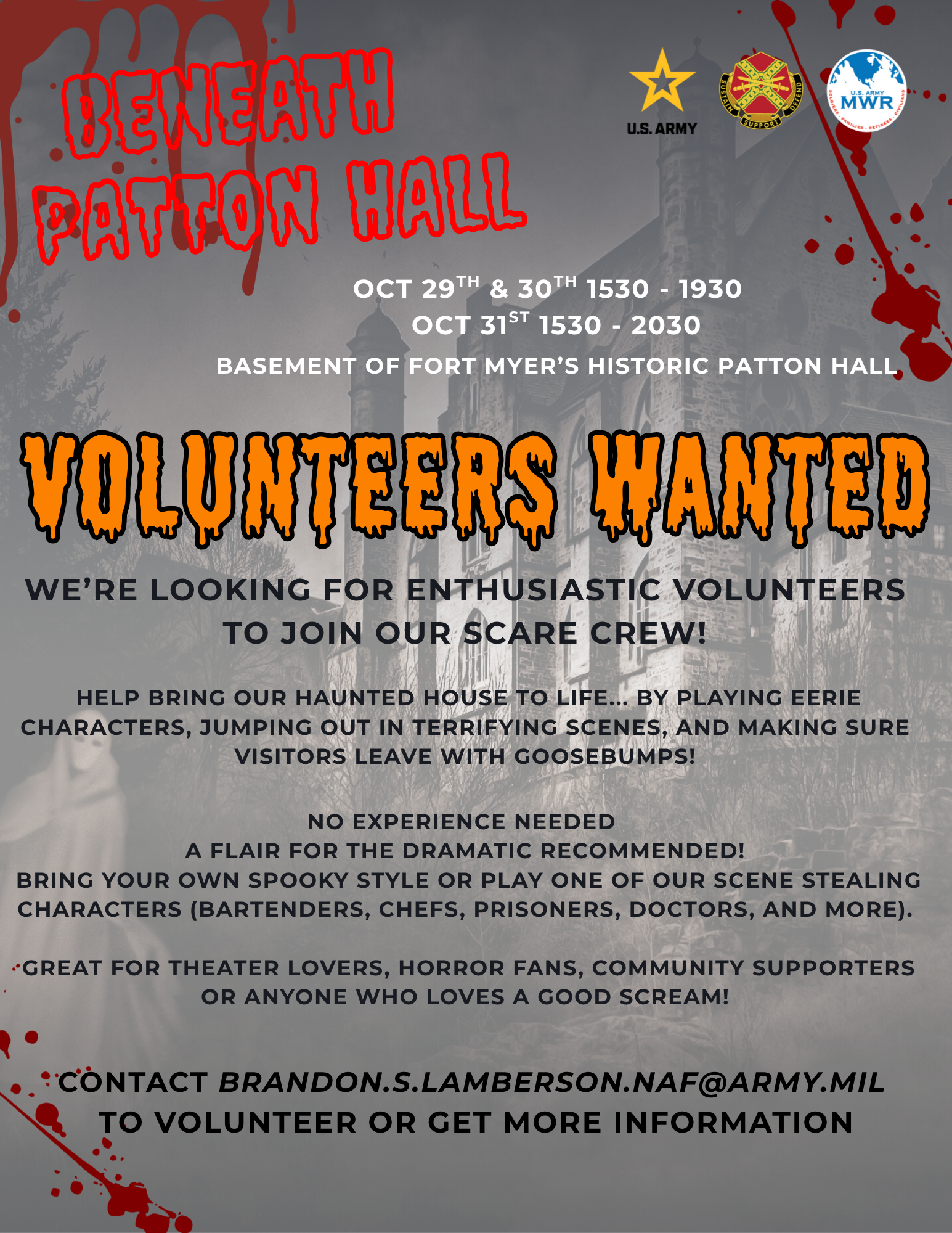 VOLUNTEERS WANTED FOR BENEATH PATTON HALL Where Fear Comes to Life — Thanks to You! A haunted house is nothing without its people. The scares, the suspense, the screams — it all starts with YOU. We’re looking for volunteers to help create the eerie atmosphere that makes "Beneath Patton Hall" unforgettable. Haunted houses are all about anticipation — the feeling that something is coming… and you're the one who makes it happen. Whether you want to jump out of the shadows, creep silently in a corner, or bring a spooky character to life, we’ve got a place for you in our haunted scenes. No experience needed – just energy, enthusiasm, and a love for Halloween (and the ability to get on base) Be your own creepy character or play some available roles for actors, scarers, and creepy scene setters (prisoners, doctors, chefs, bartenders, extras) Perfect for horror fans, theater kids, or anyone who loves to perform Dates: October 29, 30, and 31 roles needed Location: Patton Hall Basement (yes is it spooky already) Contact/Sign-Up: brandon.s.lamberson.naf@army.mil