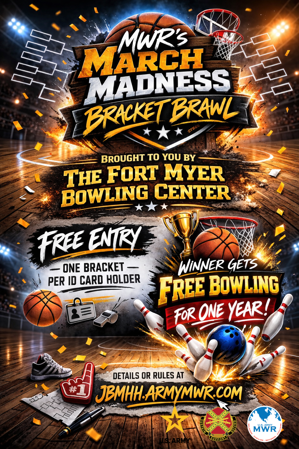 JBMHH’s March Madness Bracket Brawl is Here! Think you’ve got the best bracket prediction skillset on the Garrison? Prove it! Join the MWR March Madness Bracket Brawl, win some bragging rights, and (oh yeah that’s right), also take home the Grand Prize of Free Bowling for One Year!